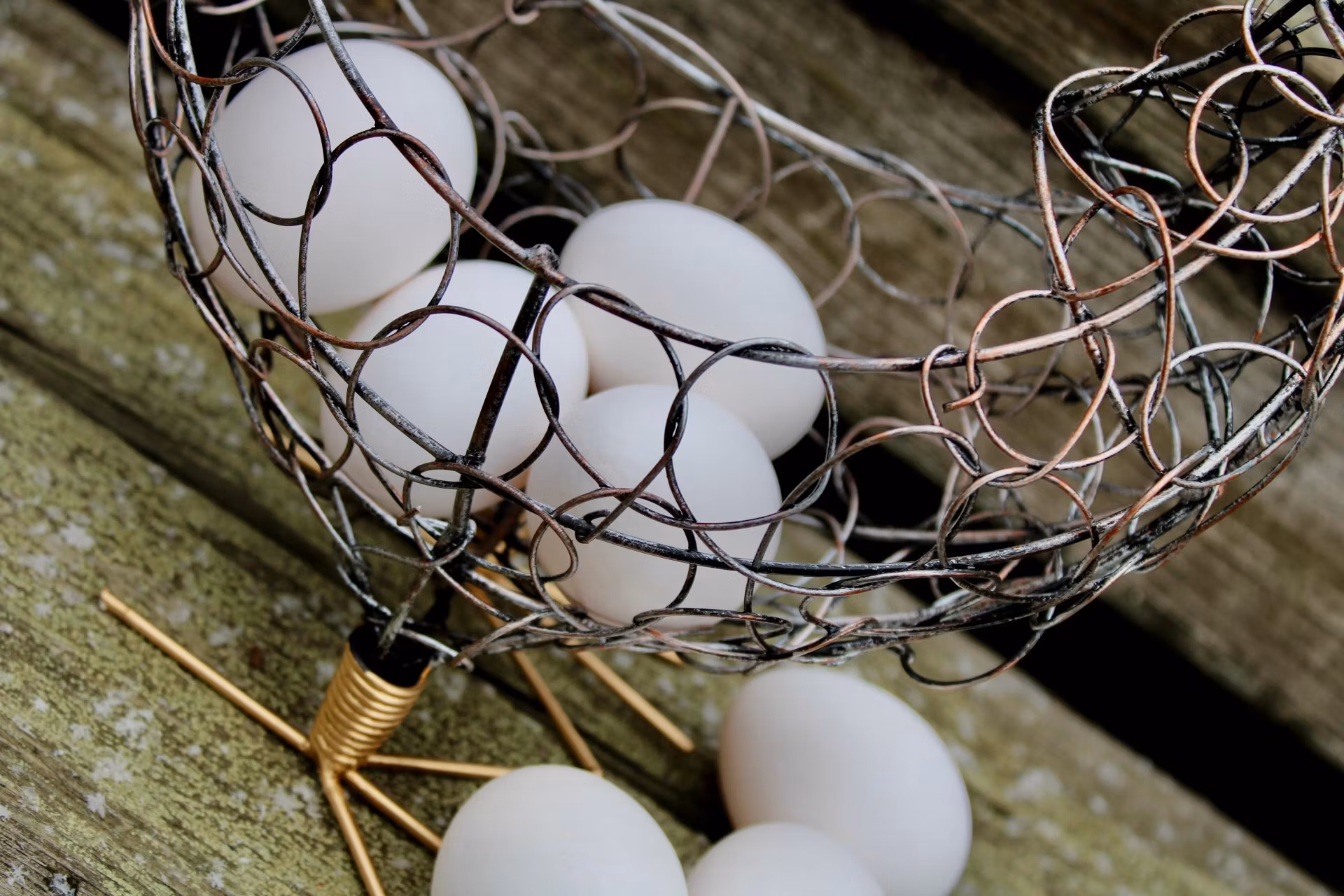 Denna vackra korg, formad som en ståtlig tupp, är inte bara en praktisk förvaring för dina ägg, utan också ett konstverk i sig.
