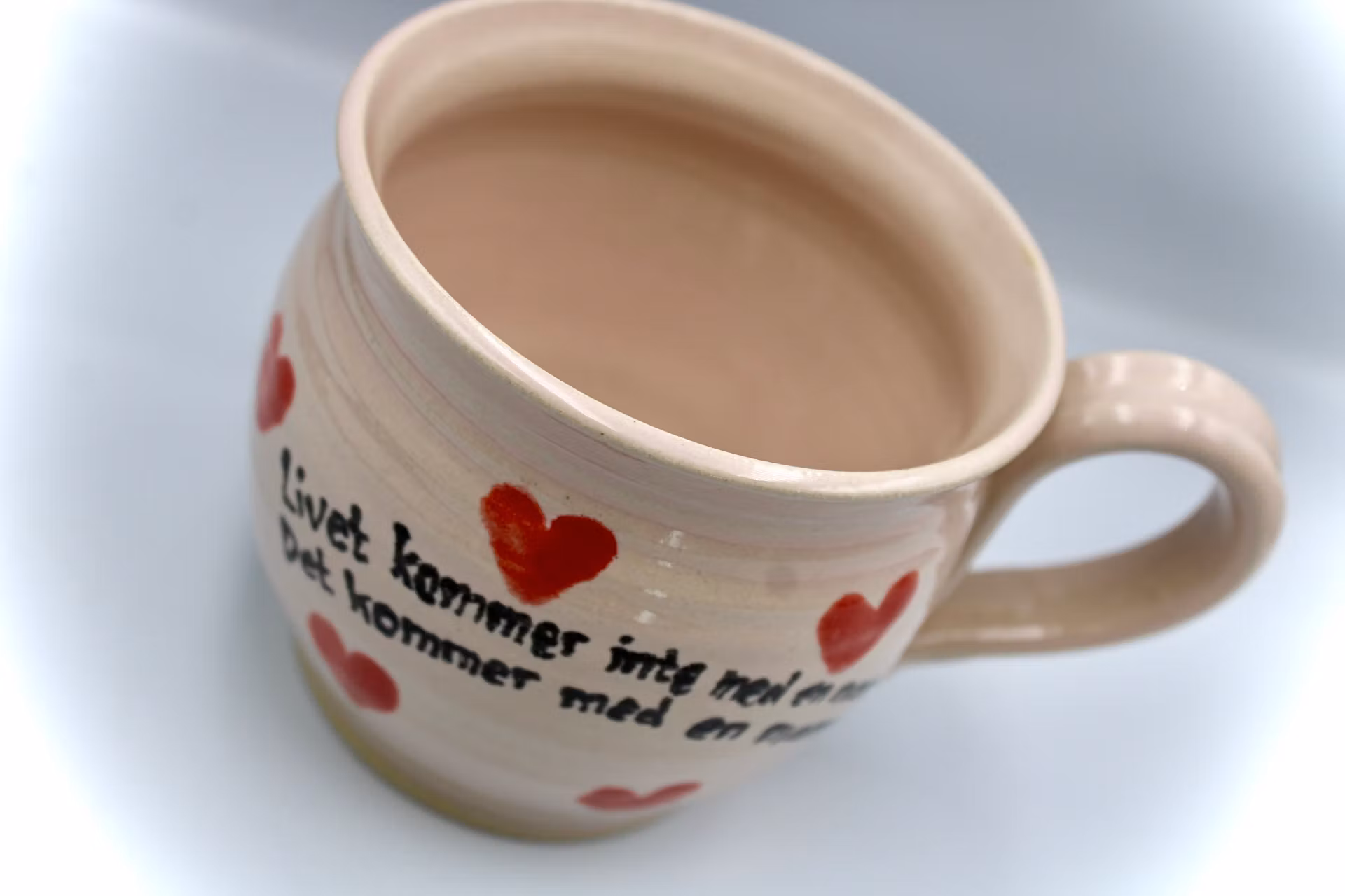Ljusrosa mugg med röda hjärtan och texten: