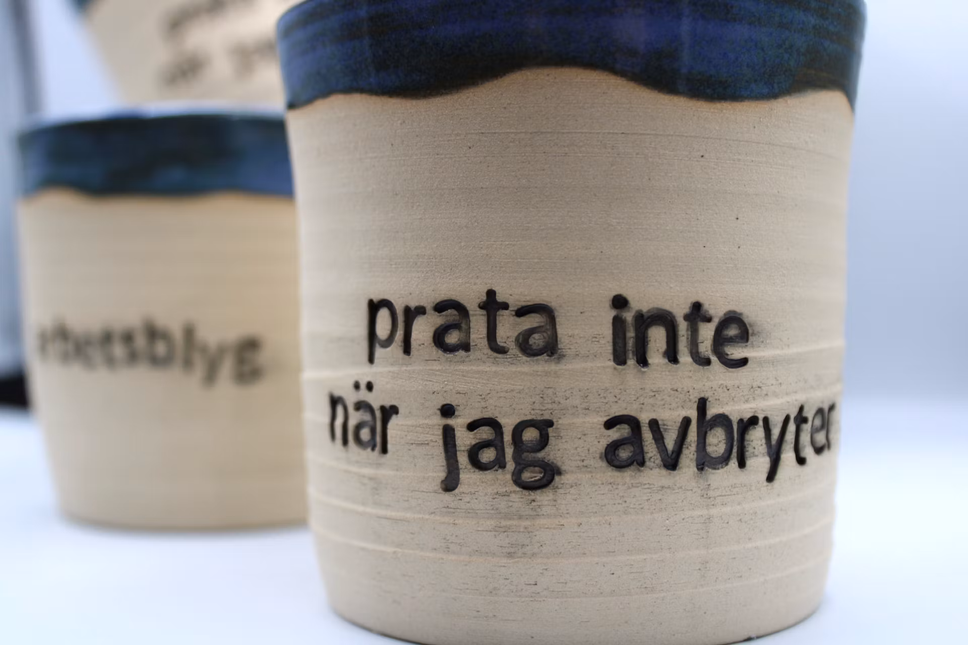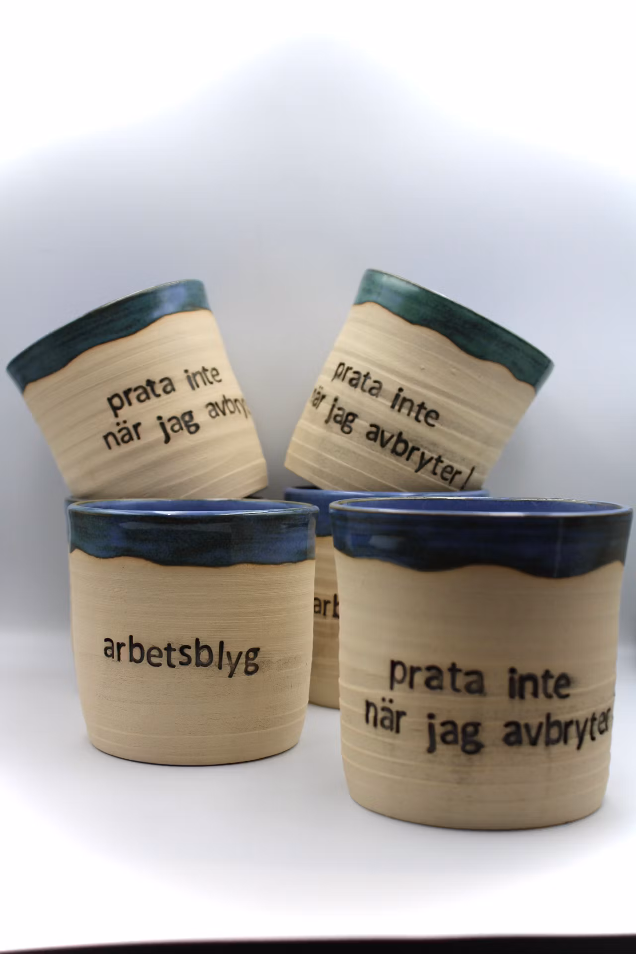Prata inte när jag avbryter-mugg 299 kr Produkten är tyvärr slut i lager. :( Dela Produktbeskrivning Recensioner Drejad mugg med texten ”Prata inte när jag avbryter”. Rymmer ca 2.5 dl vätskaGlaserade med en fantastisk fin blå nyans som skiftar i grönt.